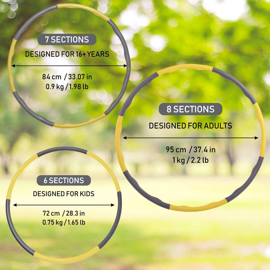 Sport24 hula hoop’s weight is 0.9kg and 95cm wide and can be adjusted to 84cm at 7 sections and even 72cm at 6 section with a weight of 0.75kg making it tailored for many more people of different ages, sizes and of differing waist circumferences. Perfect for adults, kids and youths.